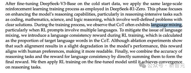 为了减轻语言混杂的问题,DeepSeek在RL训练过程中引入了「语言一致性奖励」,计算方法是CoT中目标语言词汇的比例。