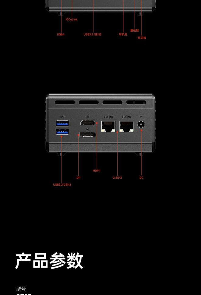 其他方面,它还支持双 PCIe 4.0×4 的固态硬盘,容量可达 4TB,而且专门采用了下压式风扇给 SSD 散热;具备 HDMI 2.1、DP 2.0、满血USB4、独立 OCulink 接口、双 2.5GbE 网口,支持 Wi-Fi 7。