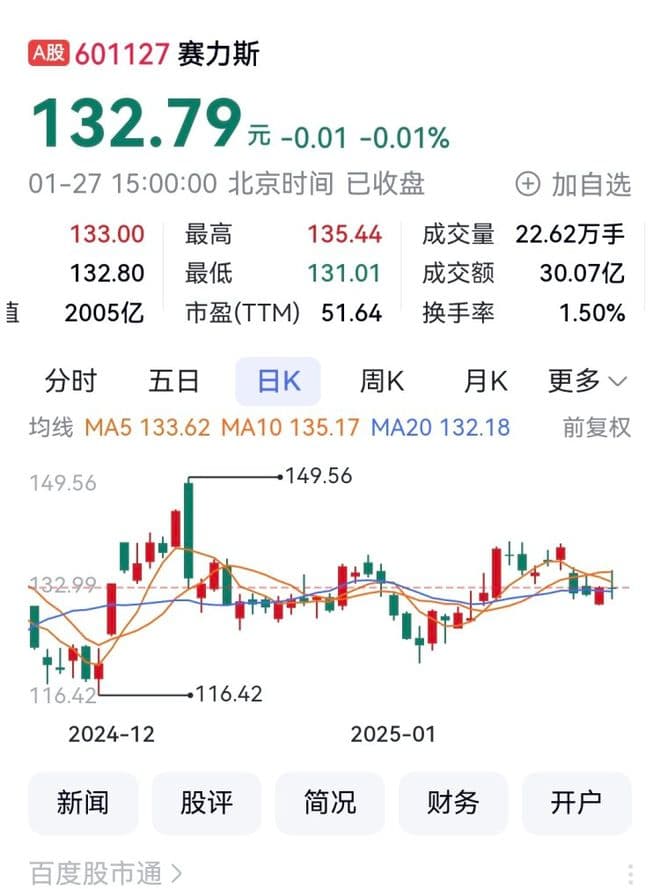 1月27日,赛力斯报收132.79元,跌0.01%,换手率1.50%,滚动市盈率51.64,总市值2005亿元,股价和市值均为渝股第一。