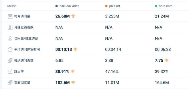 由30余家媒体联合发布的“AI产品榜”曾统计,发布仅一个月,海螺AI的月访问量就大涨了860%。另据SimilarWeb显示,至今海螺AI仍保持着极为优秀的数据表现,全球月访问量、平均访问停留时间、跳出率甚至超越了OpenAI旗下Sora、PIKA等同样知名的视频生成网站。