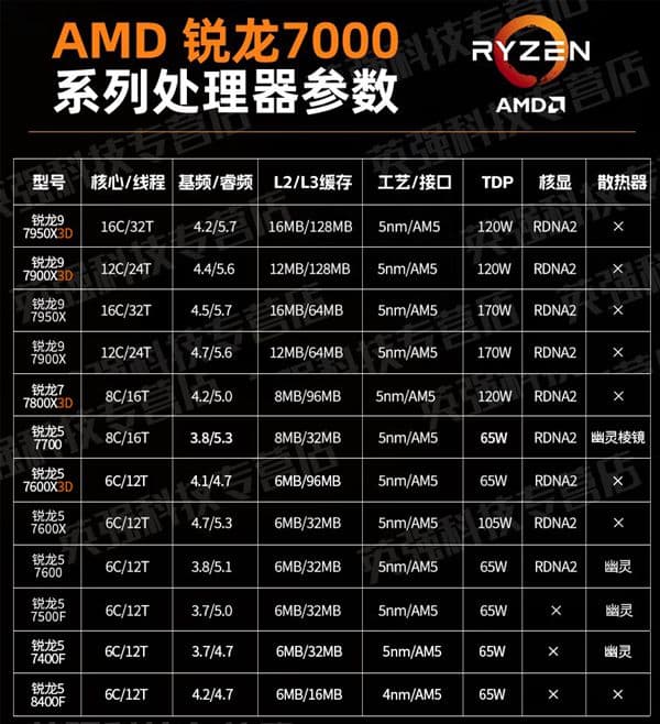锐龙5 7400F相比于此前的锐龙5 7500F,规格上只是加速频率从5.0GHz降低到4.7GHz,其他原封不动:6核心12线程,6MB二级缓存,32MB三级缓存,3.7GHz基准频率,Radeon 610M集成显卡,65W热设计功耗,自带幽灵散热器。