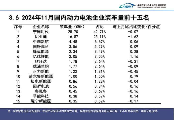其中,宁德时代(300750.SZ)上月仍稳坐国内动力电池装车榜首,其11月在国内实现了28.7 GWh的装车量,市占率达42.71%,较上月下滑了0.07个百分点。