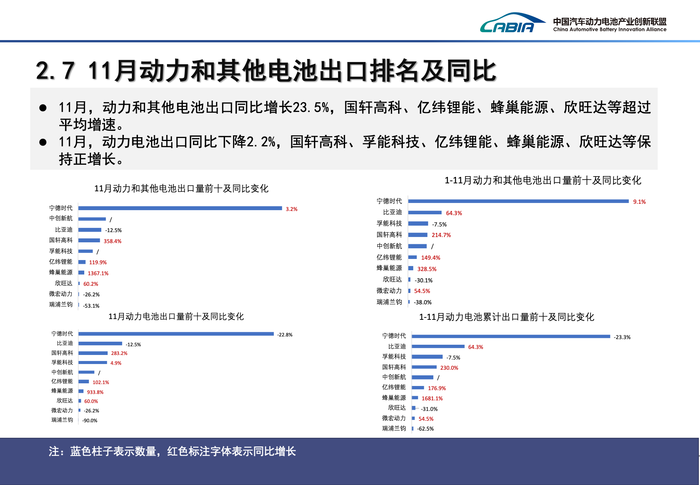 出口方面,11月,国内动力和其他电池合计出口21.9 GWh,同比增长23.5%。合计出口占当月销量18.5%。