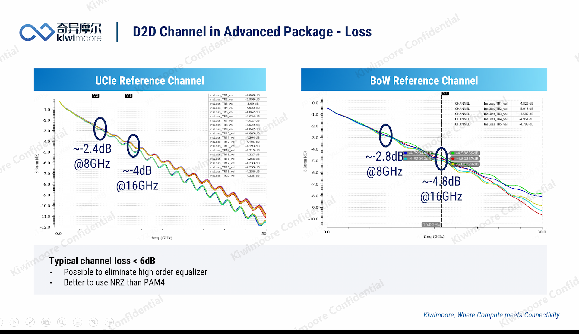 D2D接口的信道特点 信道条件通常是接口研究的起点,接口电路的架构搭建、微结构选取到具体电路的实现无不以信道特性作为出发点,D2D接口的设计也不例外。相比传统高速接口,D2D接口的信道表现了较多新的特点,这主要是由D2D接口的应用环境和封装形式所带来的。众所周知,D2D接口主要用于芯粒间的高带宽数据互联,这一应用场景决定了D2D接口信道的两个主要特点:一、信道长度较短,一般局限在封装内部;二、信道数量大,布线密集。同时,这一应用场景也决定了D2D接口往往面对较为先进的封装形式,其布线通道通常是基板(substrate)甚至是硅中介层(silicon interposer),我们分别称之为D2D接口的标准封装(standard package)和先进封装(advanced package) 。 相比以PCB走线为主的传统互联方式,D2D标准封装和先进封装的显著特点是节距(pitch)的减小。在标准封装中,芯片凸点(bump)的节距从传统封装的0.5~1mm减小到100~200um,而在先进封装中,这一物理尺寸进一步微缩到30~60um。这一变化首先带来了一系列信道物理尺寸的同步微缩,包括互联走线的线宽、线距和金属厚度等。而这些物理尺寸的微缩进一步引起了信道电学特性的改变。概括而言,从传统封装到先进封装,信道的单位长度电阻显著增大,而其单位长度的等效电感和电容基本保持不变。考虑到在D2D标准封装和先进封装下其信道长度显著缩短,信道整体的等效电感和电容显著缩小。具体而言,先进封装下的D2D信道的电学特性变化主要表现在如下方面:
