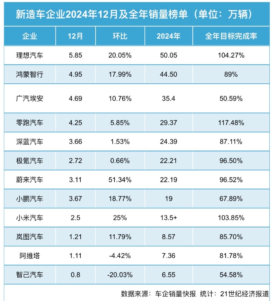 新造车2024年销量放榜:理想夺冠,零跑、小米超额,超七成未完成全年目标