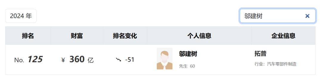 据“胡润富豪榜”,2023年10月,邬建树以560亿元财富位列《2023年·胡润百富榜》第74位;但一年后的2024年10月,《2024年·胡润百富榜》上,邬建树的财富估值却缩减为360亿元,大降200亿元,位列第125位。